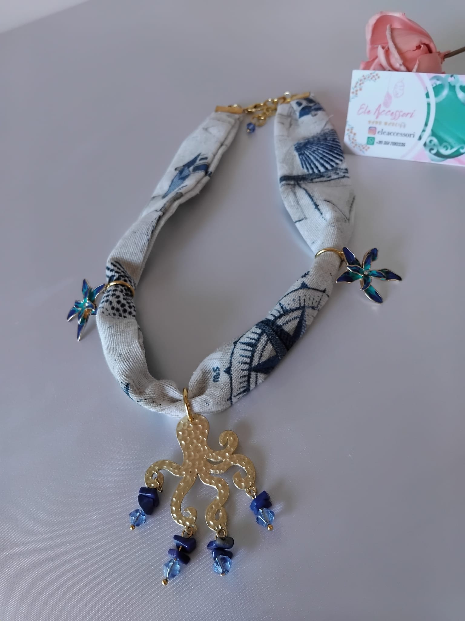 Collana in cordino Diy e ciondolo a forma di pesce in metallo colore oro, fattoun pò pieghevole in movimento, decorato con perline in cristallo.